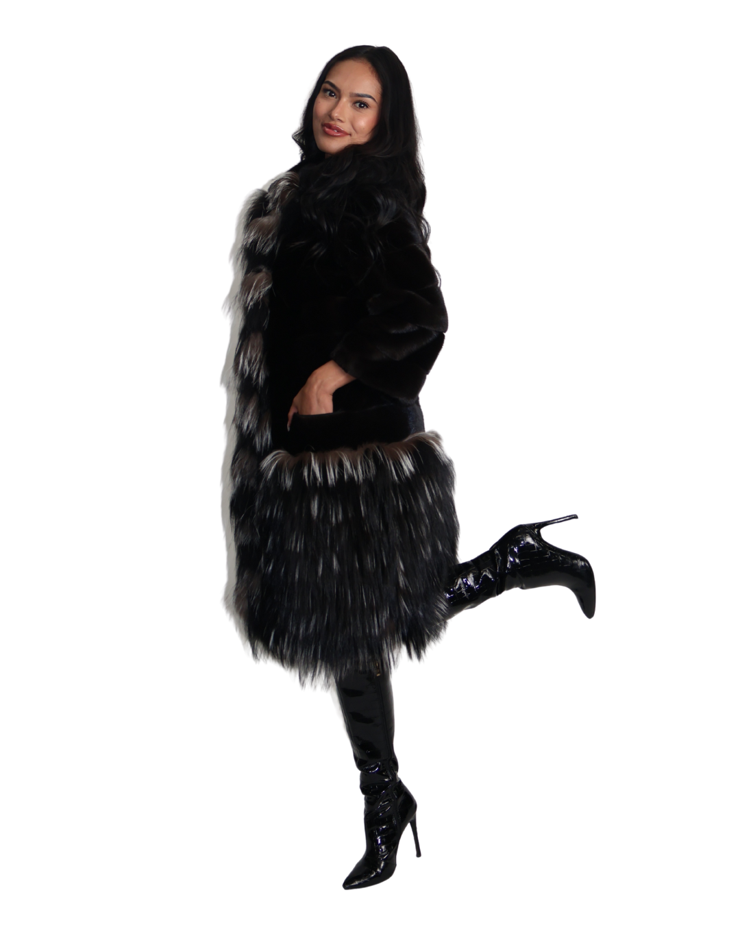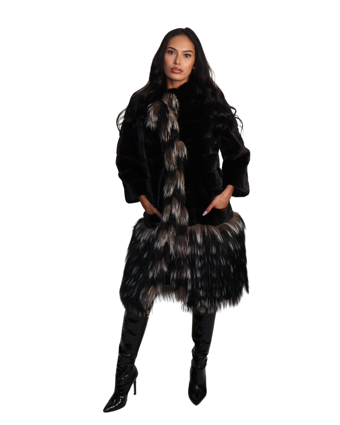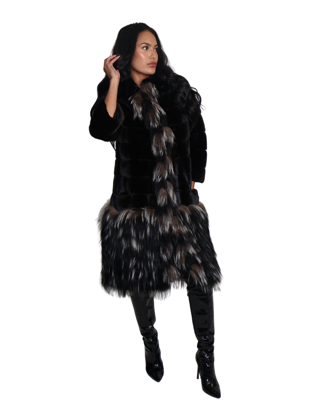 Black Sculped Sheared Mink Stroller with Silver Fox Trim